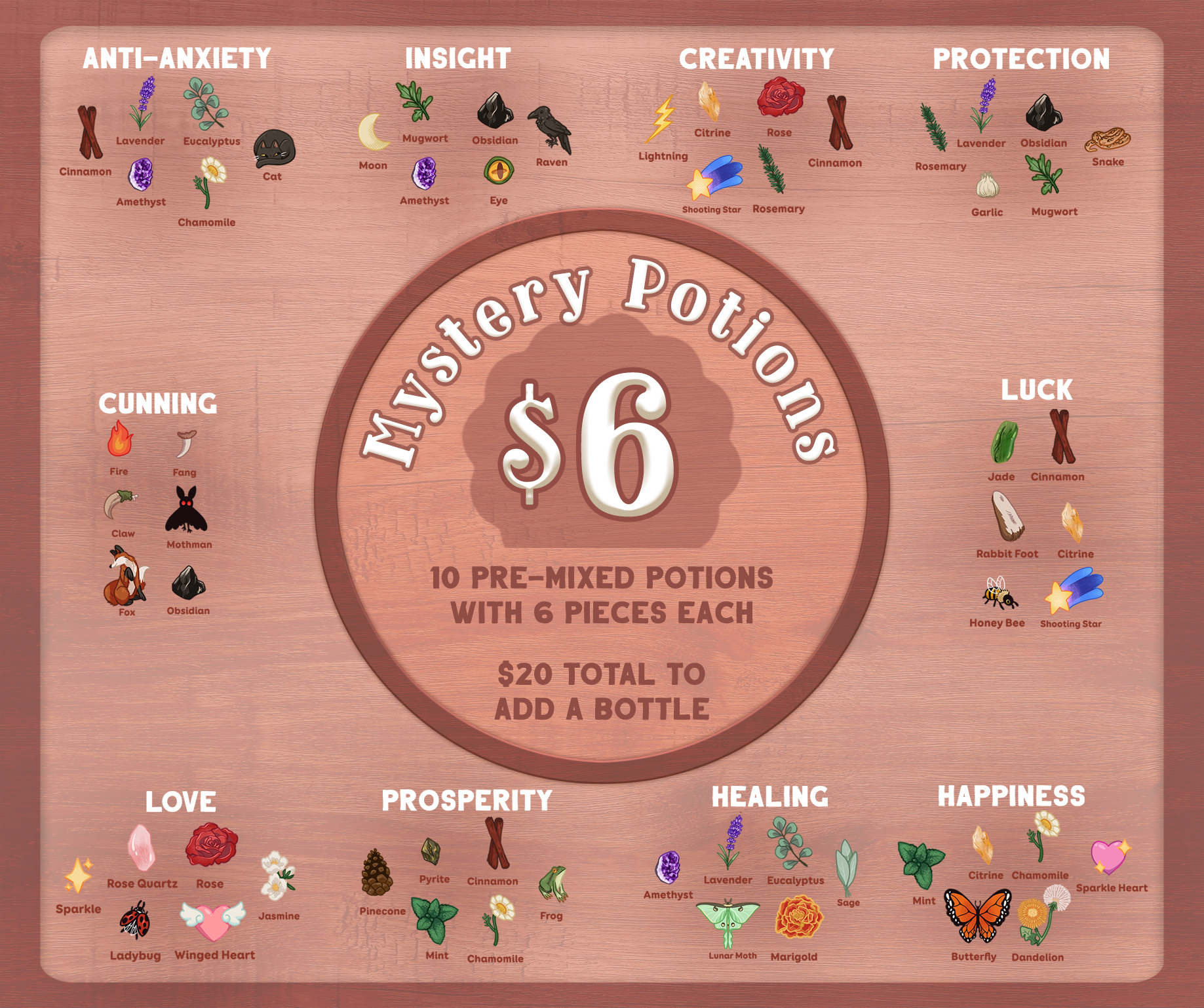 To be played in relation to our openable Potion Bottle keychains! Let fate decide what sort of potion you need right now, with 10 possible ingredient mixes to receive!