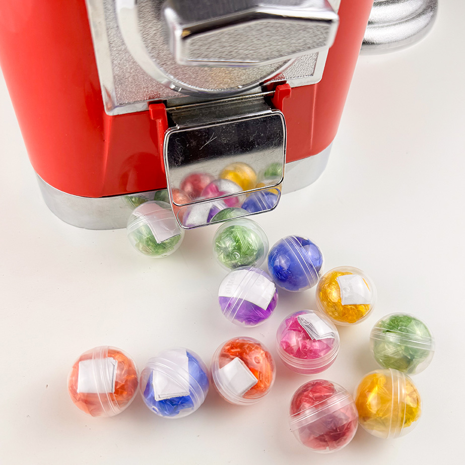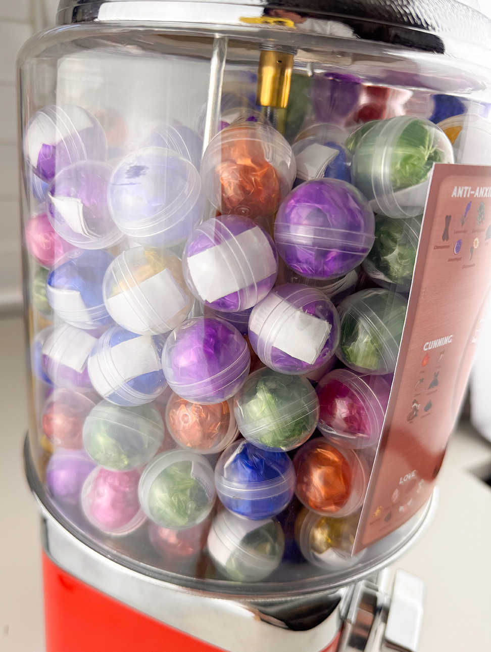 Each gacha purchased will equal one spin, and inside each ball comes a slip to tell you what potion you got with a list of the pieces, 6 shaker pieces inside a small bag, all wrapped up in a colorful cellophane sheet that corresponds to the mix.