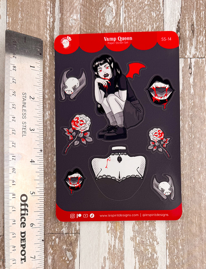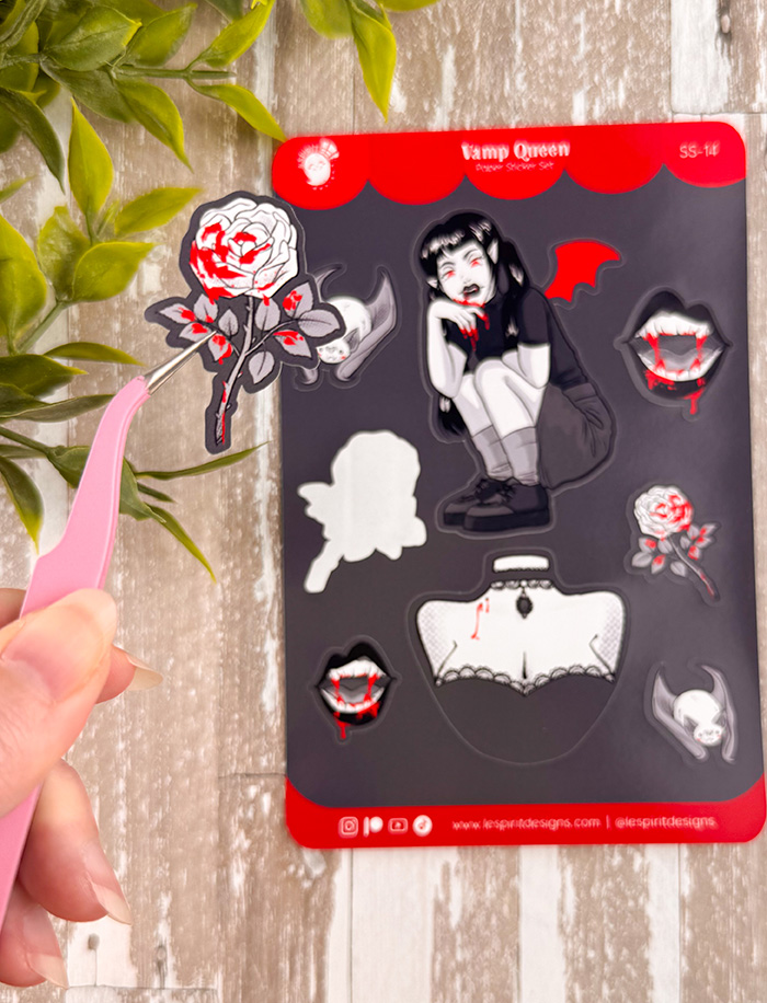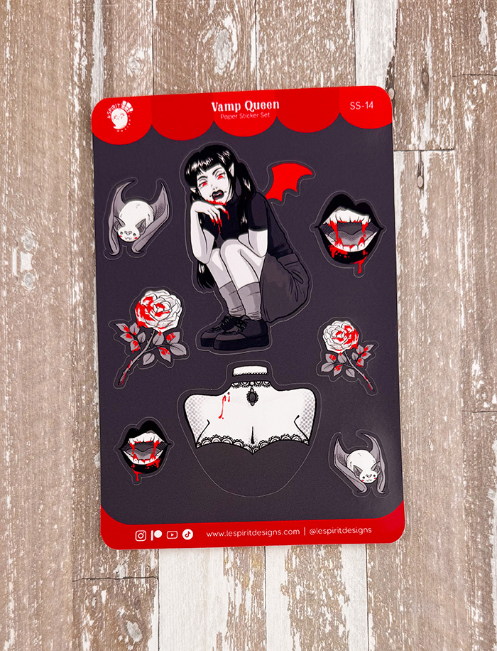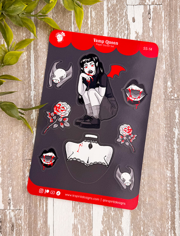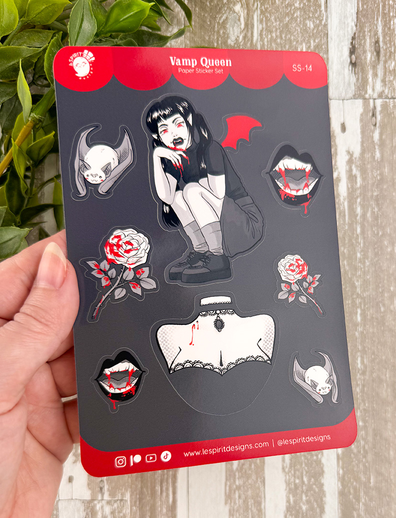A gothic noir sticker sheet of greys, blacks and whites with pops of bloody red! A modern vampire baddie, bloody fangs and roses, some little bats and a gothic bust.